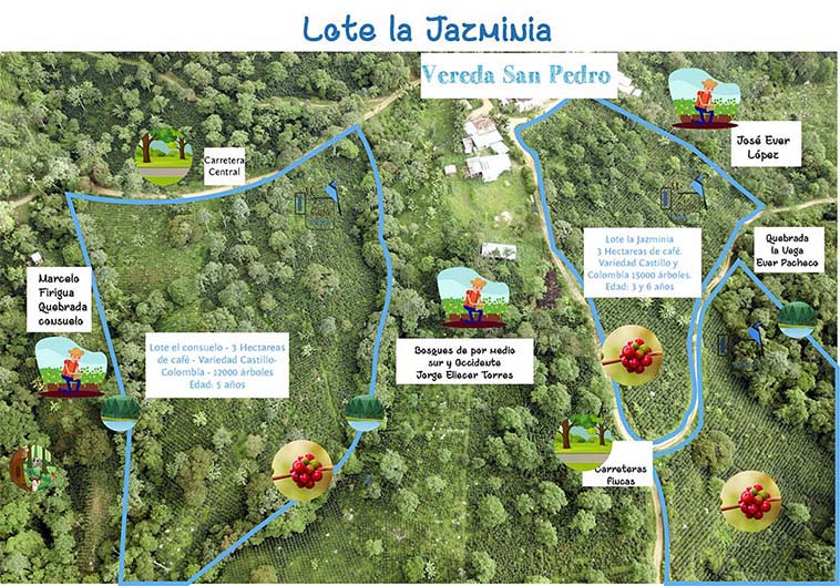 Lotes San Pedro: La Jazminia, Finca el Consuelo, finca la piscina, finca el bosque, el corral, y la Isla, productores de la región.